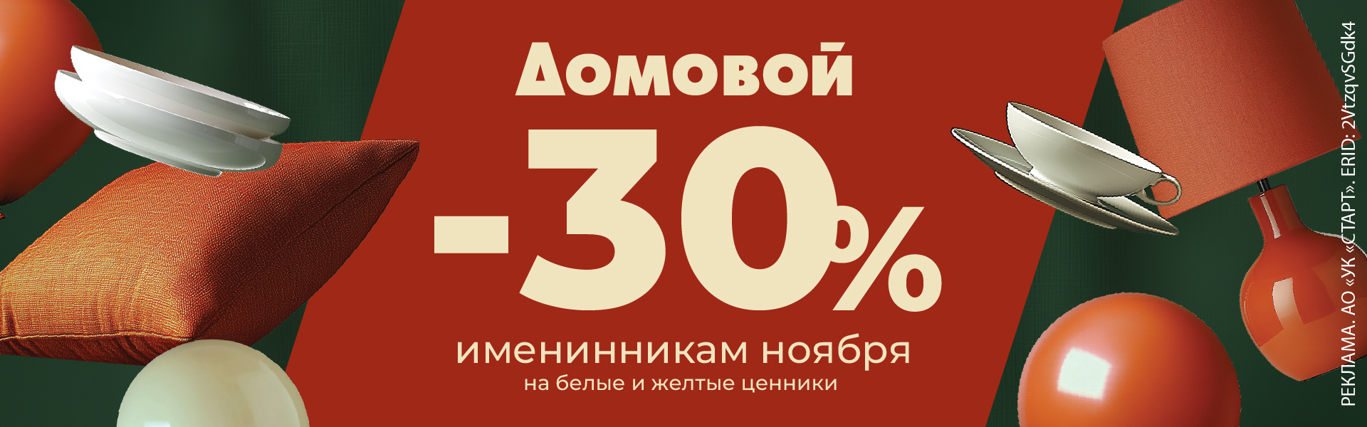 Скидка 30%* предоставляется именинникам в период текущего календарного месяца при предъявлении дисконтной карты «Домовой» на кассе до оплаты покупок и применяется автоматически, если в анкете покупателя указана дата рождения, соответствующая текущему календарному месяцу.